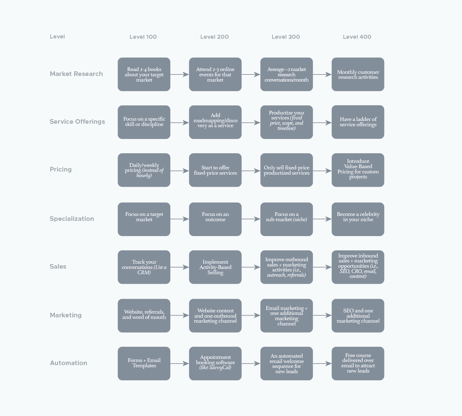 - Level 300: Productize your services (fixed price, scope, and timeline)