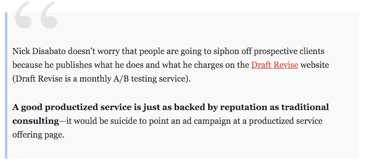 Jason: Productized consulting might be a good stepping stone — either to, or from, bigger engagements — but in order to get to the place you can even start thinking about client packages, you have to first do the work. Yes. Absolutely. No arguments here. Jason: Reapplication is one of your least valuable offers, and sadly, that’s the definition of productized services. I would never recommend it to consultants who are just starting out. I completely disagree. Reapplication — doing the same service a second or third or tenth time — is a wonderful way to: