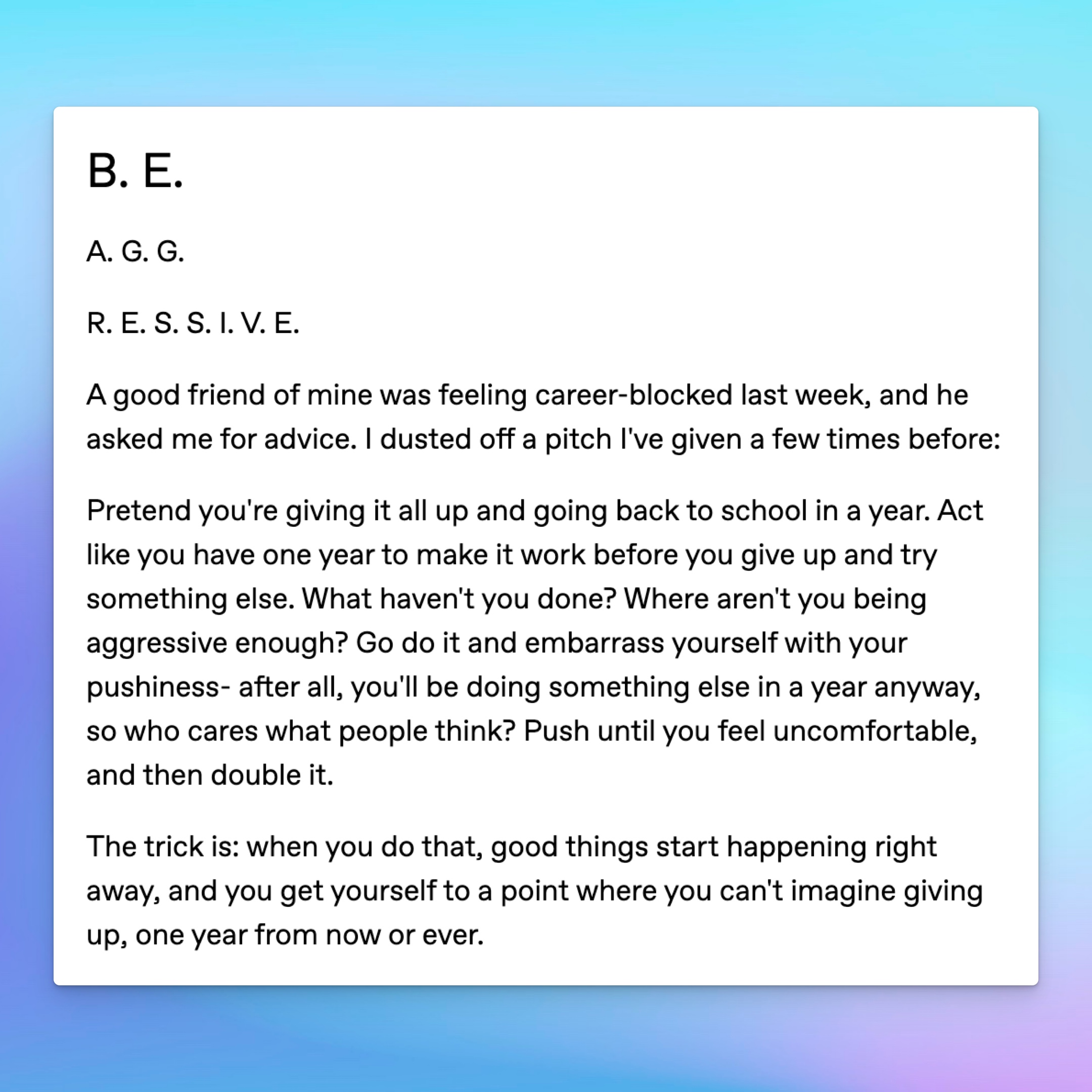 I first read BE AGGRESSIVE back in, i dunno? 2010. The timestamp says posted 15 years ago so it has been quite a bit.